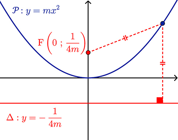 Avec le cercle et l’ellipse, la parabole est une des courbes planes les plus simples qui soient. On peut la décrire comme un ensemble de points vérifiant une propriété géométrique facile à énoncer. Donnez-vous un point F et une droite Δ qui ne passe pas par F. L’ensemble des points à égale distance de F et de Δ forme une parabole (voir l'article « Une droite, un point, c’est tout »). Le point F en est le foyer et la droite Δ la directrice. Partir de cette définition permet d’explorer les propriétés de cette courbe géométriquement. On peut préférer une approche plus analytique. En choisissant convenablement son repère orthonormé, on peut considérer qu’une parabole est une courbe d’équation y = mx2 où m est un réel strictement positif. Dans ce cas, le foyer F a pour coordonnées et la directrice a pour équation