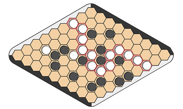 Le jeu de Hex se joue à deux avec des pions noirs et des pions blancs sur un plateau en forme de losange pavé par des hexagones. Le premier joueur qui parvient à relier les deux bords de sa couleur avec ses pions gagne la partie.