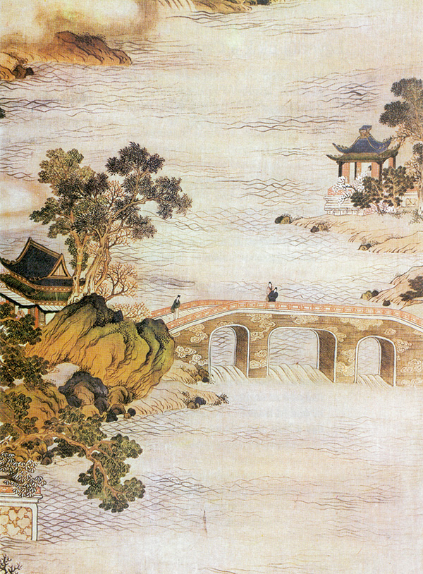 Peinture du XVIe siècle représentant un paysage avec un pont.