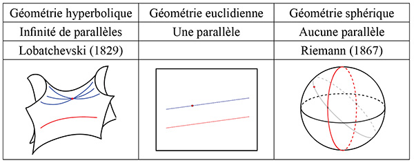 La géométrie euclidienne (300 avant J.C.) repose sur des définitions d’objets géométriques (points, droites, etc.) et sur cinq postulats, règles de base pour travailler avec ces objets. Le premier postulat affirme par exemple qu’un segment peut toujours être tracé en joignant deux points quelconques. Le cinquième, plus complexe, implique que pour toute droite, par tout point n’appartenant pas à cette droite, il passe une unique parallèle à la droite. Ici des droites sont dites parallèles si leur intersection est vide.
