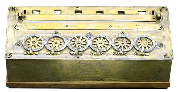 Cette machine, conçue par Blaise Pascal (1623-1662) lorsqu’il avait 19 ans seulement, est vraisemblablement la première calculatrice mécanique. Il l’avait imaginée pour aider son père, alors premier président de la cour des aides de Normandie et en a construit une vingtaine d’exemplaires. Utilisant roues dentées et engrenages, elle permettait de faire additions et soustractions et, par itérations, multiplications et divisions (voir Les secrets de la pascaline, Jean-Jacques Dupas, Tangente hors-série 85, 2023). Le modèle proposé à la vente, s’utilisait également pour les calculs topographiques : il comporte huit roues dentées et un « reporteur » ajoutant les retenues dans les opérations.