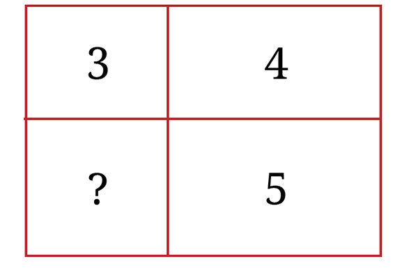 Un rectangle est divisé en quatre rectangles plus petits, comme sur la figure. On connaît les aires de trois d’entre eux : 3, 4 et 5.