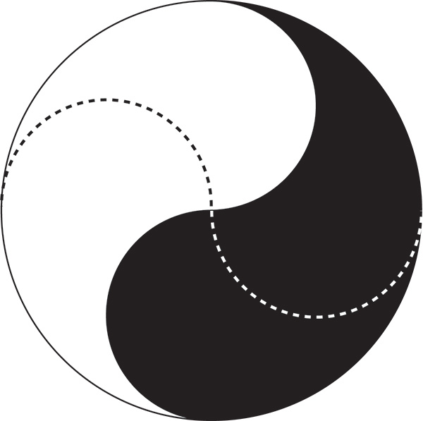 La monade est divisée en deux parties, le Yin (en noir) et le Yang (en blanc). En faisant pivoter la frontière entre le Yin et le Yang d’un quart de tour autour du centre du disque, on divise celle-ci en quatre parties d’aires égales.