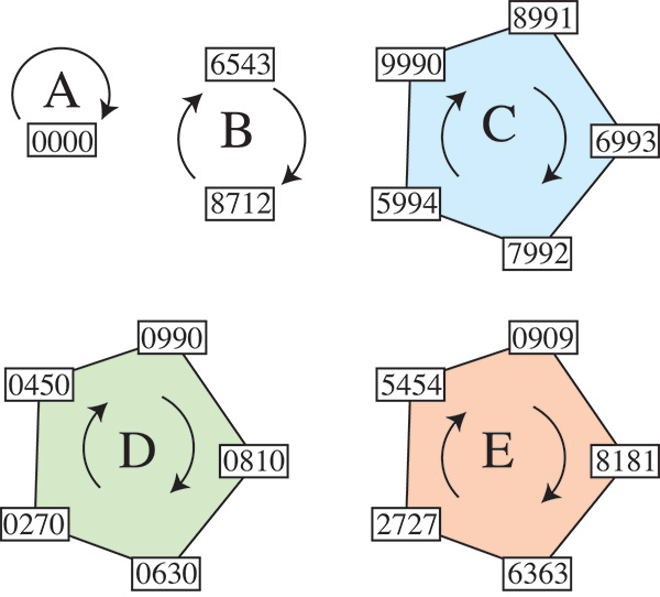La première publication de Kaprekar à propos de 6174 date de 1946, mais il explora bien d’autres pistes. Dans une variante de son algorithme, il ne réordonne pas les chiffres, mais retourne simplement l’écriture du nombre avant de soustraire le plus petit du plus grand. Le nombre d’écritures à quatre chiffres étant fini, on sait qu’on aboutira à un puits ou à un cycle. Testons l’algorithme en partant de 6174 par exemple. Ici encore, on autorise le zéro comme premier chiffre.