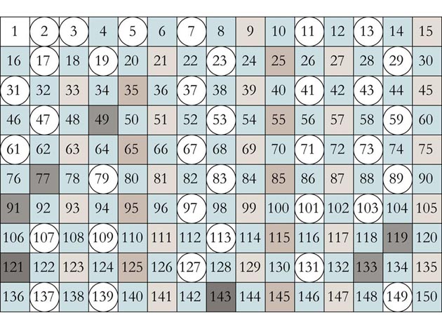 Dans l'Antiquité, Ératosthène (276-194 avant notre ère) a montré comment déterminer les nombres premiers inférieurs à un nombre donné, en éliminant tous ceux qui ne le sont pas (voir Tangente 149). Par exemple, pour connaître la table de tous les nombres premiers inférieurs à 150, on commence par dresser la table de tous les nombres de 2 à 150. On garde 2, qui est premier, et on supprime ses multiples, ce qui ne demande aucun calcul : il suffit en effet de se déplacer de deux en deux dans la table. On recommence avec le premier nombre non supprimé, c'est-à-dire 3, en opérant de même, et ainsi de suite. On obtient le tableau ci-dessous.
