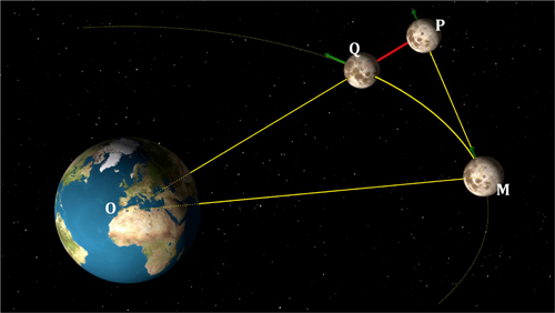 Si la Lune allait tout droit, sans subir aucune force, en une seconde elle serait au point P du schéma (qui n’est évidemment pas à l’échelle). Mais en fait, à cause de la force qu’exerce sur elle la Terre, elle se trouve au point Q. La hauteur de chute est donc la distance PQ. Depuis l’Antiquité, on sait que l’orbite de la Lune est « quasiment circulaire » et uniforme, la vitesse de la Lune en M est donc tangente au cercle orbital, et ainsi perpendiculaire au segment [OM]. Le vecteur contenu dans la droite engendrée par cette vitesse est donc perpendiculaire au vecteur