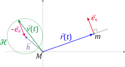 Le lieu H des vecteurs vitesses paramétrés par le temps (ou hodographe) est ainsi contenu dans un cercle de rayon u et dont le centre est pointé par le vecteur . L’hodographe H sera tout le cercle si θ (t) parcourt tout le segment [0, 2π], ou seulement un arc de ce cercle sinon. Dans le cas des orbites périodiques des planètes autour du Soleil, l’hodographe est évidemment le cercle complet…