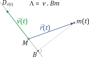 Commençons par mesurer Λ, l’aire du parallélogramme formé par la position et la vitesse à l’instant t. On projette orthogonalement en B le vecteur position sur la droite