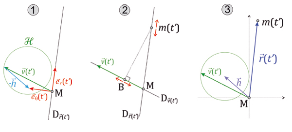 Pour chaque nouveau point de la trajectoire, correspondant à un instant t’, on procédera en trois étapes. Admettons que l’hodographe H soit tout le cercle (orbite périodique). En choisissant un autre point sur H, on construit un nouveau vecteur vitesse . Le vecteur de Hamilton, constant, permet alors de construire