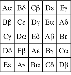 Un carré latin d’ordre 5 avec des lettres grecques.