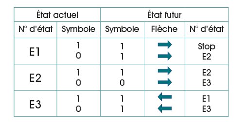 Soit un ruban de Turing dont toutes les cases contiennent le symbole 0 avant l’exécution de l’algorithme du castor affairé à trois états E1, E2, E3. Partez d’une case et appliquez-lui l’état de démarrage E1. Le 0 devient 1. La flèche indique que l’état suivant, E2, doit être appliqué à la case à droite de la première. Comme elle contient un 0, elle reste avec 0 et c’est l’état E3 qui doit alors être appliqué à la case suivante à droite (la flèche est encore vers la droite). Recommencez autant de fois qu’il le faut jusqu’à tomber sur Stop. Combien de « 1 » cet algorithme crée-t-il avant de s’arrêter ?