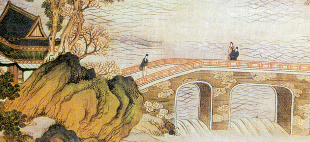 Peinture du XVIe siècle représentant un paysage avec un pont.
