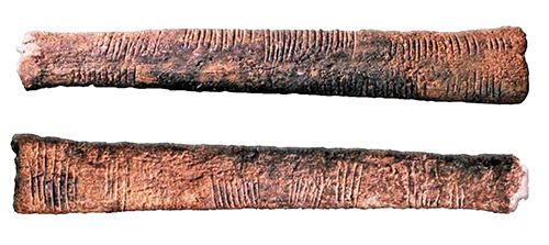 Surgit alors une surprise : les os d’Ishango. Ces artéfacts archéologiques découverts dans l’ancien Congo belge (actuelle République démocratique du Congo) se présentent sous la forme de bâtons osseux d’une dizaine de centimètres de long avec un morceau de quartz fixé à une extrémité. Ils ont entre 20 000 et 35 000 ans et représentent probablement le premier calculateur de poche jamais connu. Selon le chercheur belge Jean de Heinzelin, les marques sur un des bâtons représentent une séquence de nombres premiers compris entre 10 et 20, ainsi que quelques séries de duplication (3–6, 4–8, 5–10…). On peut aussi penser que, pour réaliser ces tables d’opération, on employa, conjointement au système décimal, le système de numération à base 12 ou 60. Et si les heureux propriétaires paléolithiques de ces bâtons les avaient utilisés comme une sorte de règle à calcul primitive ?