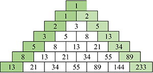 La suite A199512 se base sur un triangle dont le côté gauche est la suite de Fibonacci et le côté droit la suite de Fibonacci purgée des termes de rang pair. Comme pour tous les triangles précédents, un terme intérieur est la somme des deux qui le surmontent – mais l’intérêt supplémentaire vient ici de ce que chaque terme intérieur (ainsi que chaque terme du côté gauche) est aussi la différence entre son voisin de droite immédiat et le terme qui surmonte la paire. Ainsi 144 (en bas à droite) est-il la somme de 55 et 89 mais aussi (par construction) la différence entre 233 et 89 :