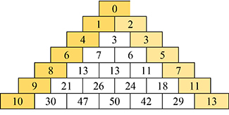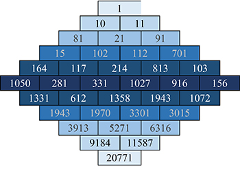 Les termes ci-dessus ne sont probablement pas les plus petits possibles contenant le chiffre « 1 » mais ils illustrent une « construction en diamant » : tout nouveau terme provoque une cascade de résultats qui doivent obéir à la règle. Ainsi « 1050 » (à gauche du diamant), ajouté à son voisin « 281 », donne-t-il bien « 1 331 ». Ce sera aussi le cas, mécaniquement, de tous les autres termes sur la même diagonale descendante.