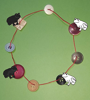La solution apparaît alors de façon lumineuse ! En choisissant un sens de déplacement sur la boucle formée par le fil, on fait se déplacer tour à tour les grenouilles d’autant de cases qu’il le faut pour amener les grenouilles blanches sur les boutons initialement occupés par les noires, et les grenouilles noires sur les boutons initialement occupés par les blanches.